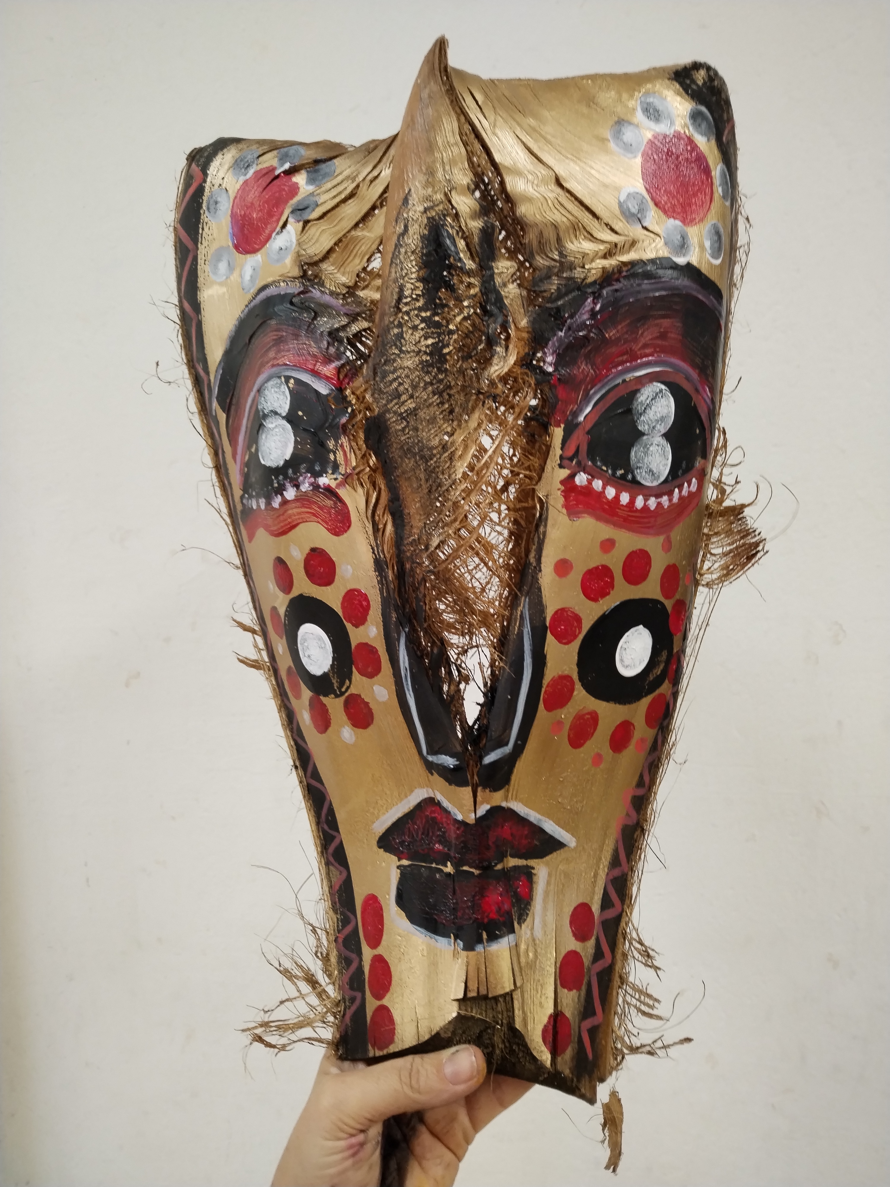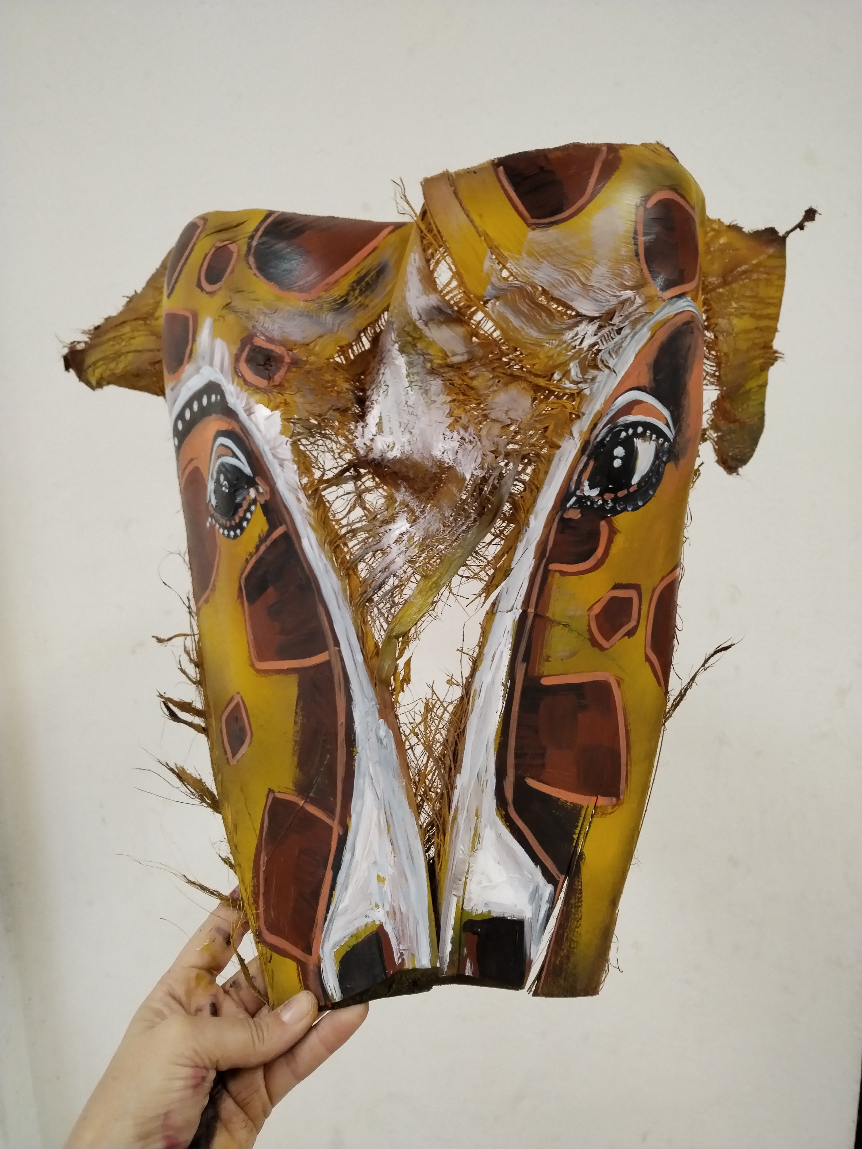 En carnavales decoramos la galería inspirándonos en África. Una alumna del taller nos ha traído cortezas de palmera. Con ella creamos máscaras tribales con pinturas acrílicas. Así que ya veis que tenemos alumnos muy inspiradores y capaces de traer un coche cargado de restos de palmeras en un viaje de vacaciones. ¿Qué más podemos pedir?